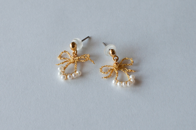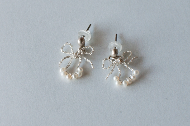 淡水パールを編みこんで、リボンの形にしました。