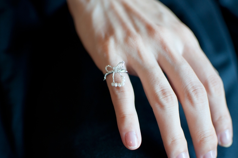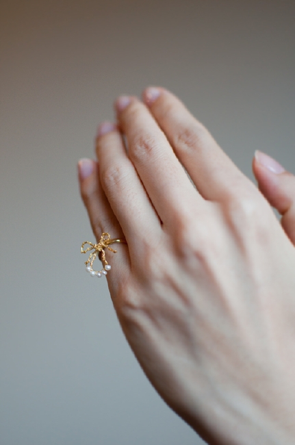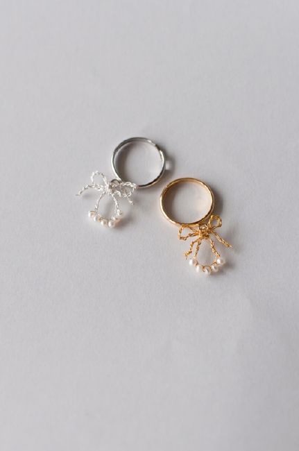 price : ¥4,500 color : 金、銀 material:ポリエステル、淡水パール、真鍮 size:3号(大きく調節可能) 同じ型のピアス&イヤリングもご用意しています。