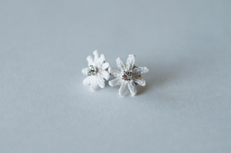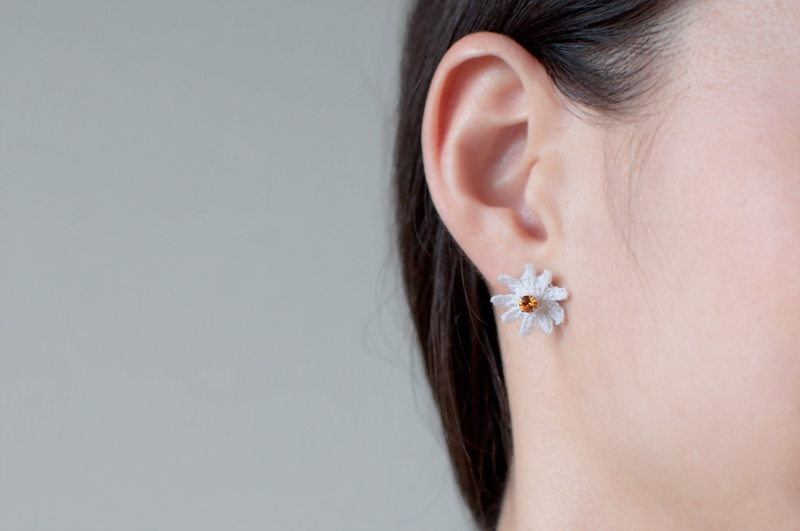 price : ¥3,900 color : (スワロフスキー色のみ変わります)クリア、ブルー、オレンジ material:キュプラ、ポリエステル、スワロフスキークリスタル、真鍮 ピアスかイヤリングをお選びいただけます。