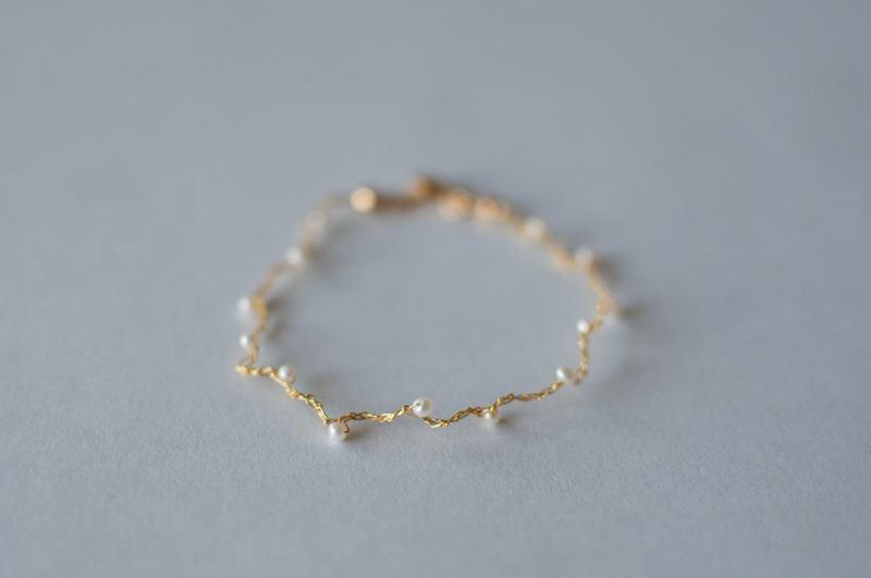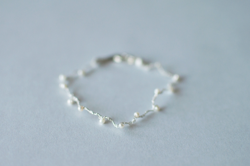 可憐な淡水パールのしずくがちりばめられたブレスレット。 極細の糸で、チェーンのように仕上げました。 繊細で肌色に優しくなじみます。
